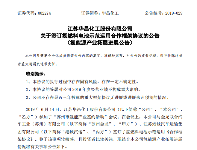 6月14日,江苏华昌化工股份有限公司(以下简称“公司”、“本公司”、)参加了“苏州市氢能产业签约活动”会议;在会议上,与金龙联合汽车工业(苏州)有限公司(以下简称苏州金龙)、江苏港城汽车运输集团有限公司(以下简称“港城汽运”)签订了氢燃料电池示范运用《合作框架协议》。
