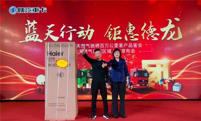 活动现场非常有幸的邀请到这样一位用户,他的车辆实现了百万公里无大修。这不仅是陕汽军工品质坚若磐石的最直接体现,也是陕汽黄金产业链给用户带来的价值。用户为了感谢陕汽,表达自己的感谢之情,特意准备了一份礼物送给陕汽重卡、潍柴动力。同时为了感谢用户对于陕汽长久以来的鼎力支持,陕汽重卡、潍柴动力领导也将精心准备的奖杯与充满惊喜的50000元大礼送与客户。