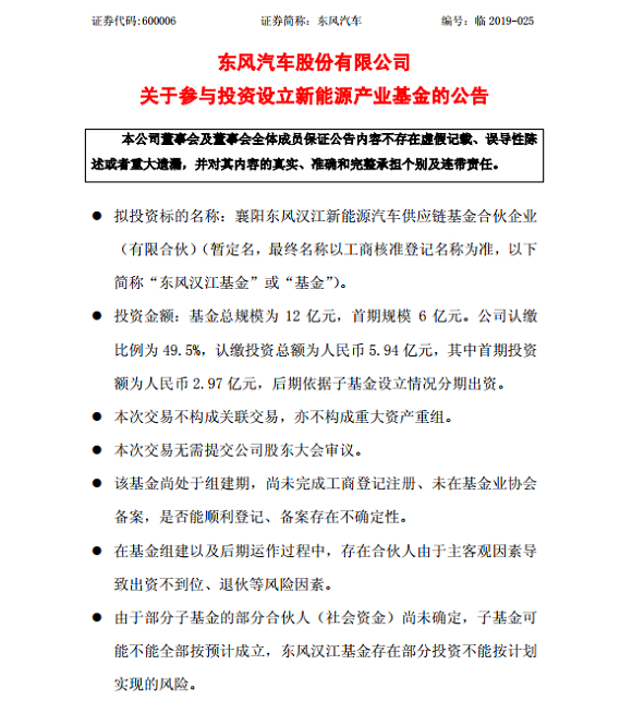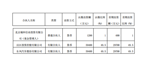 6月21日,东风汽车股份有限公司发布公告称公司拟以自有资金5.94亿元(其中首期投资额为2.97亿元,后期依据子基金设立情况分期出资)与北京瑞和信业投资有限公司(简称“北京瑞和”)、汉江投资控股有限公司(简称“汉江控股”)共同设立东风汉江基金,公司为有限合伙人。