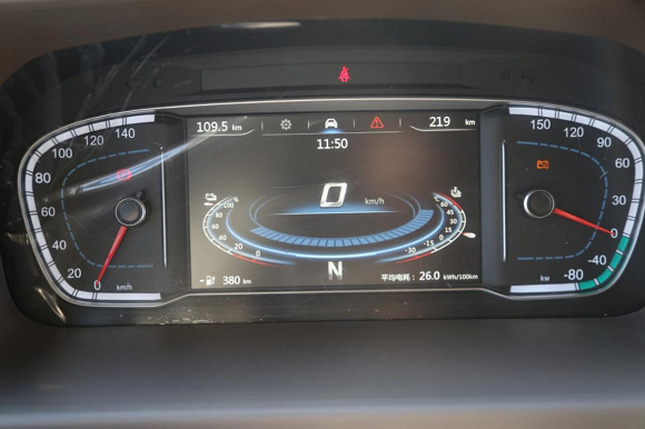 仪表盘相比传统车型有所变化,采用了对称式设计。左边的是车速表,右边的是电机功率输出表。中间采用了大块的LED彩色液晶显示器,有关车辆的所有情况都可以从该显示器调取,通过方向盘上的多功能按钮调整即可。该显示器一共有四种显示界面,一般情况下停留在车速界面,下面几张照片对应的是不同的显示界面。