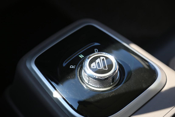 换挡采用了旋钮+LED背光指示换挡,一共有R、N、D三个挡位。这种设计很漂亮,黑色镜面银色边框看起来非常的有质感。就是由于拍摄时阳光直射,挡位显示的背光显得有点暗,如果能增加一个指针应该可以避免这个问题。