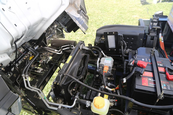 掀起欧马可智蓝的驾驶室,下面安装了电控系统的散热器以及该车的蓄电池等系统