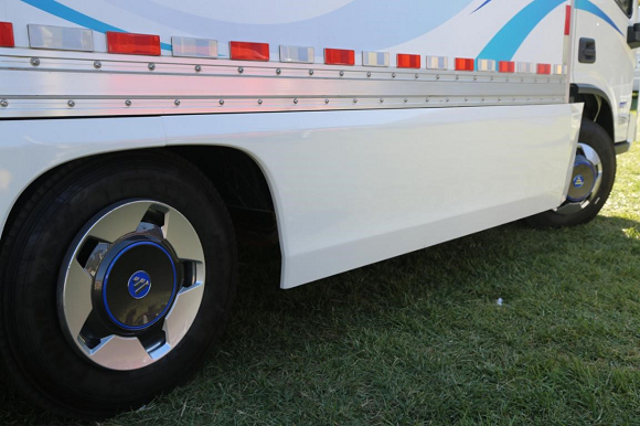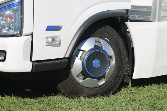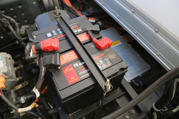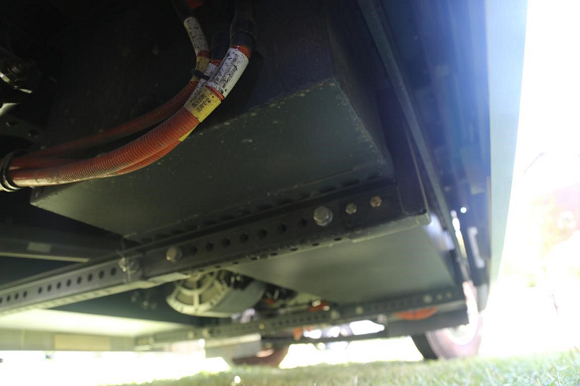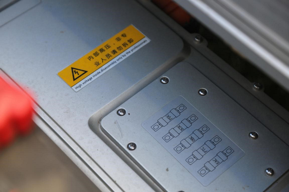 车架左右两侧全部加装了侧裙,保护车架左右两侧的电池。该车采用的是天津力神的磷酸铁锂电池,电池的总容量为104.7kWh,此外还可以选择宁德时代等多家主流电池生产商。