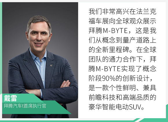 在发布活动现场,拜腾首席执行官戴雷博士(Dr. Daniel Kirchert)表示:“我们非常高兴在法兰克福车展向全球观众展示拜腾M-Byte,这是我们从概念到量产道路上的全新里程碑。在全球团队的通力合作下,拜腾M-Byte实现了概念阶段90%的创新设计,是一款个性鲜明、兼具前瞻科技和高端品质的豪华智能电动SUV。”