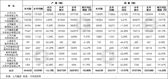 上汽集团1-6月累计销量达2937296辆 同比下滑16.62%