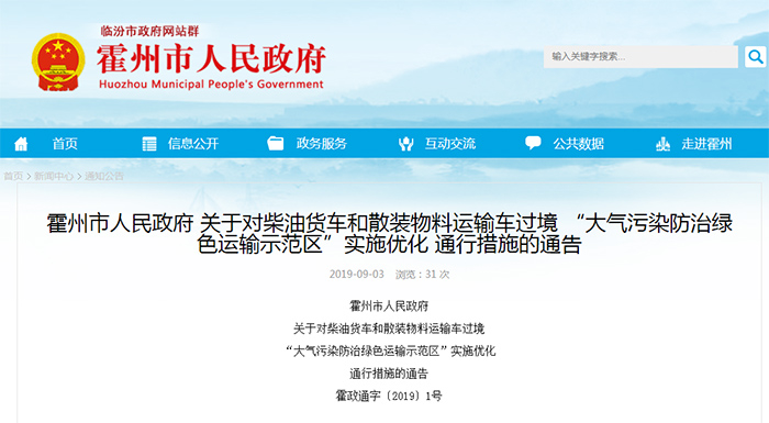9月3日,霍州市人民政府发布了《关于对柴油货车和散装物料运输车过境“大气污染防治绿色运输示范区”实施优化通行措施》的通告(以下简称“通告”)。通告显示,总质量4.5吨以下(不含)使用新能源或清洁能源且装载货物采取集装箱等密闭措施的货运车辆,可正常通行。