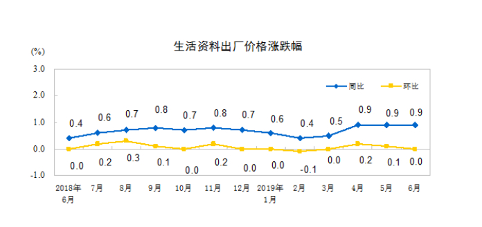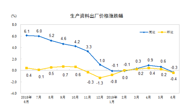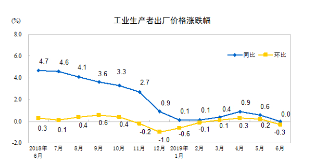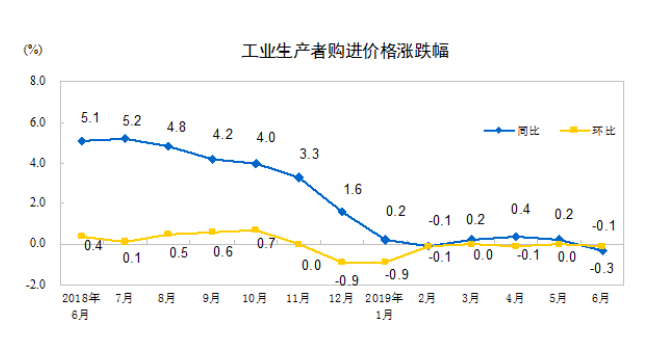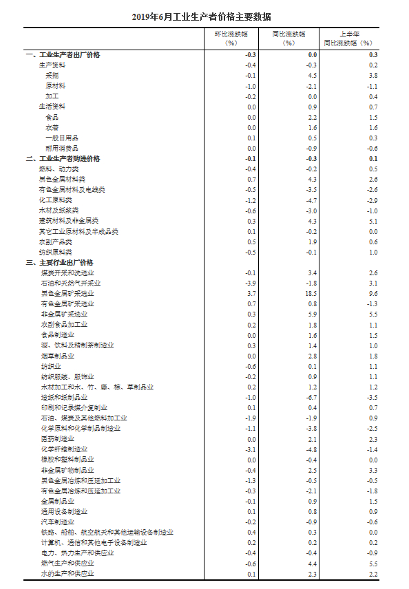2019年6月份,全国工业生产者出厂价格同比持平,环比下降0.3%;工业生产者购进价格同比下降0.3%,环比下降0.1%。上半年,工业生产者出厂价格比去年同期上涨0.3%,工业生产者购进价格上涨0.1%。