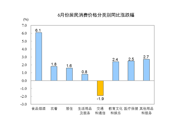 6月份,食品烟酒价格同比上涨6.1%,影响CPI(居民消费价格指数)上涨约1.79个百分点。其中,鲜果价格上涨42.7%,影响CPI上涨约0.71个百分点;畜肉类价格上涨14.4%,影响CPI上涨约0.59个百分点(猪肉价格上涨21.1%,影响CPI上涨约0.45个百分点);禽肉类价格上涨7.4%,影响CPI上涨约0.09个百分点;鸡蛋价格上涨6.1%,影响CPI上涨约0.03个百分点;鲜菜价格上涨4.2%,影响CPI上涨约0.10个百分点;粮食价格上涨0.6%,影响CPI上涨约0.01个百分点;水产品价格下降0.5%,影响CPI下降约0.01个百分点。