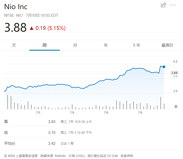 截至发稿时,蔚来汽车(NYSE:NIO)美股开盘后上涨5.15%,现报3.88美元。此前蔚来汽车股价已连续六个交易日上涨。
