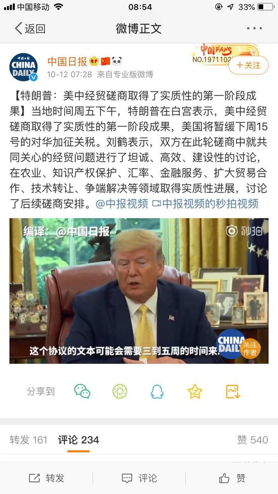 当地时间周五下午,特朗普在白宫表示,美中经贸磋商取得了实质性的第一阶段成果,美国将暂缓下周15号的对华加征关税。刘鹤表示,双方在此轮磋商中就共同关心的经贸问题进行了坦诚、高效、建设性的讨论,在农业、知识产权保护、汇率、金融服务、扩大贸易合作、技术转让、争端解决等领域取得实质性进展,讨论了后续磋商安排。