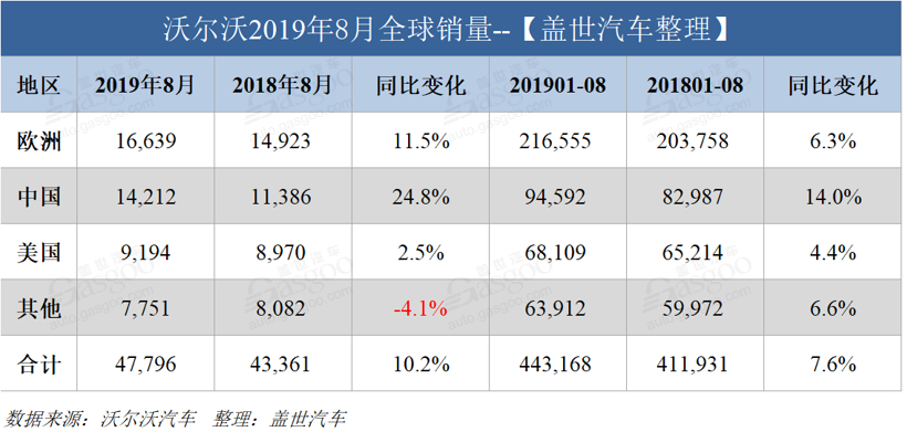 根据沃尔沃汽车官方公布的销量数据,今年8月份,沃尔沃延续上半年及7月份的强劲势头,全球销量实现了10.2%的增幅,共售出47,796辆汽车,欧洲、中国和美国三大市场销量均实现了增长。截至8月底,沃尔沃汽车今年累计销量为443,168辆,较去年同期增长7.6%。