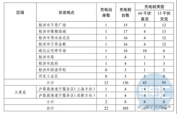 目前,遂宁市已建成充电站22座、充电桩305台。预计到2030年,遂宁市规划布局建设电动汽车充换电站1345座、充电桩52435台,覆盖全市96个乡镇、127个加油站、8个高速服务区、20个旅游景区、210个机关事业单位和114个大型小区及商场,充分保障全市电动汽车的充换电需求。