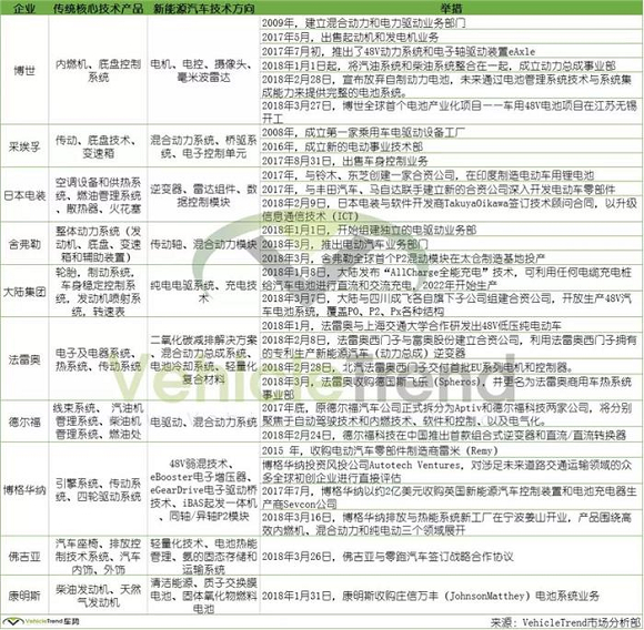 从上图我们可以看到,大陆集团、法雷奥、德尔福、博格华纳等企业在近两年的动作更加频繁,对于新能源汽车技术方向的目标和产品也非常清晰。除大陆集团外,其余几家企业对于混合动力技术更加偏好;法雷奥和佛吉亚由于传统业务影响,对于亲良好材料和技术有重点关注;佛吉亚和康明斯则似乎更希望往清洁能源方向发展。