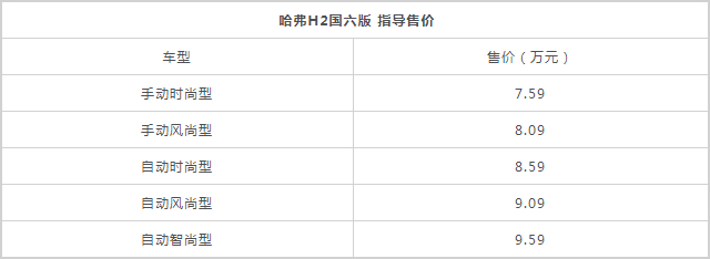 哈弗H2国六版车型上市 售价7.59-9.59万元