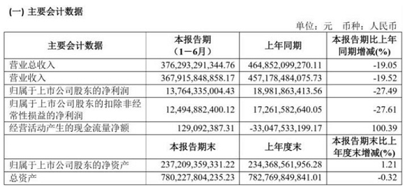 8月29日,上汽集团(600104)披露2019年半年度报告。报告显示,上汽集团上半年(1-6月)营业总收入超过3762.93亿元人民币,相比去年同期的4648.52亿人民币下滑19.05%;与此同时,归属于上市公司股东的净利润同比下滑27.49%,基本每股收益1.178元,比去年同期的1.625元下滑27.51%。