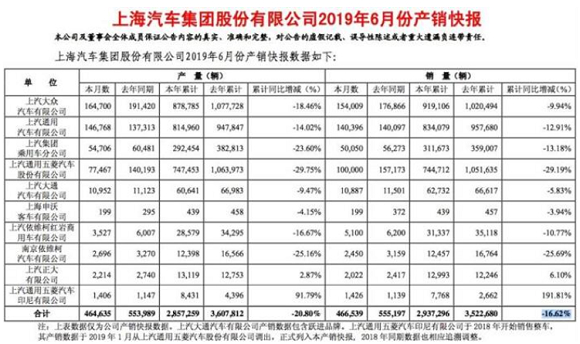 与营收下滑对应的是销量的下降。根据上汽集团官方公布的上半年销量数据显示,上汽集团1-6月份实现销量2937296辆,相比去年同期的3522680辆下滑了16.62%;其中6月单月,上汽集团销量为466539辆,相比2018年6月的555197的成绩下滑了15.97%。而其最新的7月份销量下滑幅度稍有收窄,单月实现销量439794辆,相比去年7月的484854辆下滑9.3%。