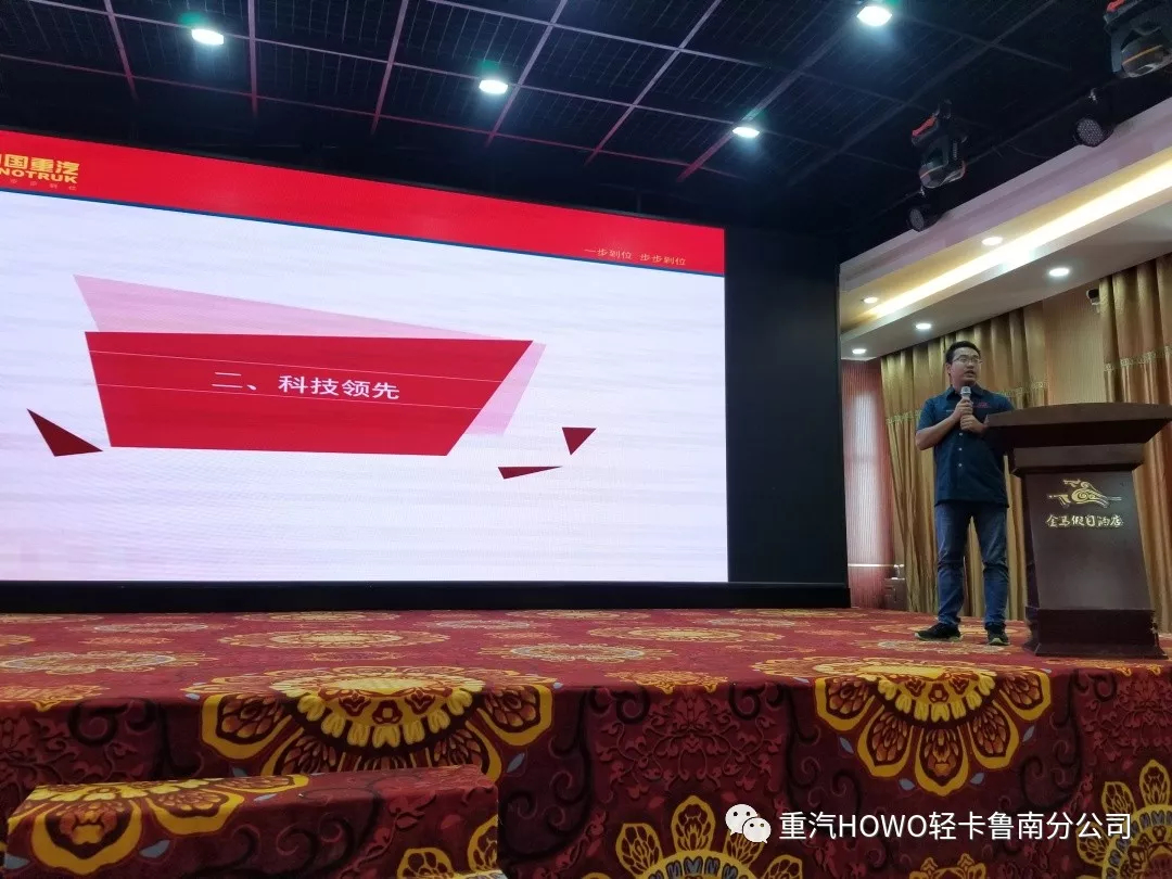 在主持人引导下,12:08分活动准时开始,现场气氛开始点燃。首先,由鲁南办赵鑫经理致开场词,让到场来宾了解重汽的历史及发展。在一阵节目过后,办事处济宁区域负责人巢鋆做PPT讲解,向到场的业界人士介绍重汽及重汽豪沃轻卡发展历程,用户收益最大化的理念、科技版车型升级亮点、各科技版推荐车型介绍、服务及经销网络等。随后由济宁宏伟张总做现场优惠及促销的讲解,顿时,引发热潮。