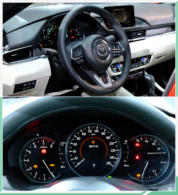 新款阿特兹内饰采用了北海道栓木、Ultrasuedenu奥司维、Napaa真皮等材质,提升豪华感;中控台整体造型平直流畅,悬浮式屏幕左侧为一键启动按钮。空调出风口造型狭长,同时下方加以镀铬装饰贯穿;方向盘采用三辐式造型且带有镀铬饰条点缀,更显精致;前方三圆盘式仪表盘采用液晶屏幕显示,功能区域划分清晰。