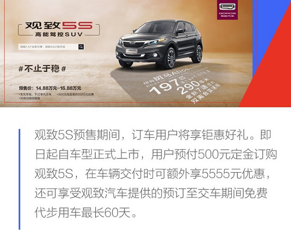 配置丰富/搭载1.6T发动机 观致5S预售14.88-16.88万元