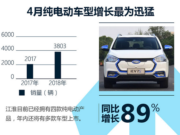 4月份,江淮乘用车纯电动车型增长最为迅猛,同比增长88.55%,销量达3,803辆,目前江淮已经推出了iEV、iEVA50、iEV6E和iEV7S四款覆盖微型、紧凑型轿车和小型SUV市场。从江淮乘用车2018年产品规划也能看出把新能源放在了第一位,除去已在4月份上市的iEVA50外,还将推出iEV6ES、新款iEV7S、iEV7长程版和iEVA60四款车型。