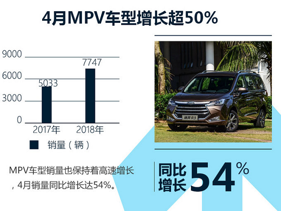 MPV车型销量同比增长53.92%,单月销量达7,747辆。在3月份,2018款瑞风M3/M4正式上市,并推出速运版和商务版车型,进一步提升产品竞争力,并满足更多细分市场消费者需求。4月份,江淮首款面向家用的MPV瑞风R3正式上市,进一步丰富了产品矩阵。根据规划,江淮年内还将推出瑞风R3自动档、2018款瑞风M5和新一代星锐三款MPV车型。