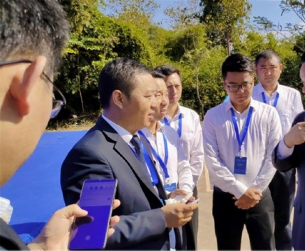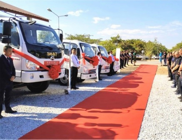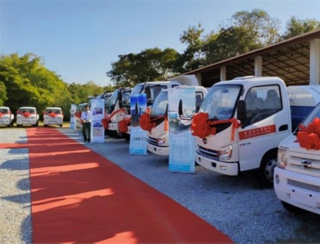 中国驻老挝大使姜再冬代表中方向老挝新闻文化旅游部赠送由云南时骏汽车制造有限公司提供的中国国产小型货车及工程车22辆,用于提升当地旅游服务保障能力。