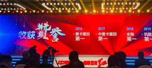 在大会致辞中,胡汉杰表示,回顾2016年到2019年,是解放人辉煌荣耀的四年,“2016年重卡重回第一;2017年中重卡重回第一;到2018年坐稳第一 ;再到2019年巩固第一。”