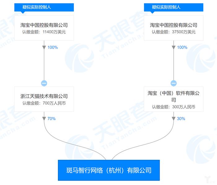 12月初,阿里斥资1000万成立斑马智行,菜鸟ET实验室主任张春晖担任执行董事兼总经理。通过股权穿透图可以看到,浙江天猫技术有限公司持股70%,淘宝(中国)软件有限公司持股30%,最终的实际控制人则为淘宝中国控股有限公司。
