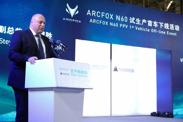 12月30日,以"生而破界"为主题,ARCFOX试生产首车下线仪式在江苏镇江北汽蓝谷麦格纳汽车有限公司隆重举行。镇江市委副书记、市长张叶飞,副市长陈可可,镇江市丹徒区区委书记谢继步,北汽新能源党委副书记、总经理马仿列,麦格纳斯太尔亚洲区副总裁Klaus