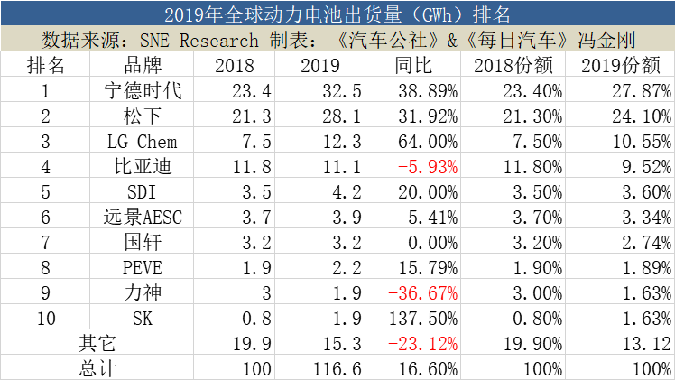 宁德时代与松下相加的市场份额从2018年的44.7%增加到2019年的51.97%。而未入榜单的企业份额从2018年的19.90%跌至13.12%