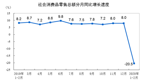 国家统计局发布:1-2月份,社会消费品零售总额52130亿元,同比名义下降20.5%。其中,除汽车以外的消费品零售额48476亿元,下降18.9%。