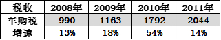 2010年车辆购置税高速增长,实现收入1792.0亿元,同比增长54.0%,比上年同期增速加快了36.4个百分点。车辆购置税收入占税收总收入的比重为2.4%。