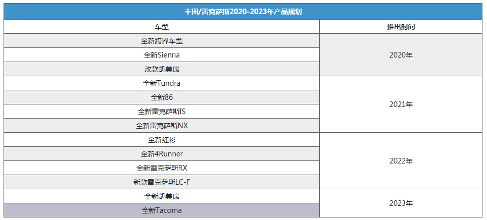 日前,有海外媒体报道了丰田以及雷克萨斯的最新产品规划。两大品牌将在2020年到2023年期间,推出全新86、全新Sienna、新款凯美瑞(中期改款)、全新Tundra、全新IS以及全新NX等车型。具体见下表: