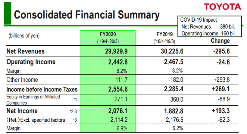 5月12日,丰田汽车公司公布了2020财年(2019.4.1-2020.3.31)财报。财报显示,该公司2020财年共售出8,958,423辆汽车,较上一财年减少18,372辆;净营收同比微跌1%至29.9299万亿日元,营业利润从2.4675万亿日元下降到2.4428万亿日元,税前利润为2.5546万亿日元;净利润为2.0761万亿日元,比去年同期增加1,933亿日元,同比增幅为10.3%。