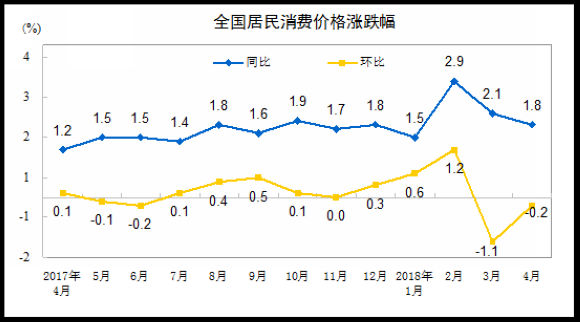 2018年4月份,全国居民消费价格同比上涨1.8%。其中,城市上涨1.8%,农村上涨1.7%;食品价格上涨0.7%,非食品价格上涨2.1%;消费品价格上涨1.3%,服务价格上涨2.6%。1-4月平均,全国居民消费价格总水平比去年同期上涨2.1%。