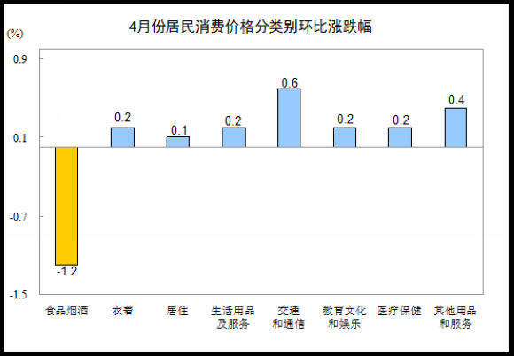 4月份,全国居民消费价格环比下降0.2%。其中,城市下降0.2%,农村下降0.3%;食品价格下降1.9%,非食品价格上涨0.2%;消费品价格下降0.5%,服务价格上涨0.3%。