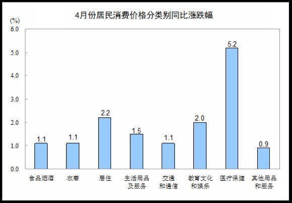 其他七大类价格同比均上涨。其中,医疗保健、居住、教育文化和娱乐价格分别上涨5.2%、2.2%和2.0%,生活用品及服务、衣着价格分别上涨1.5%和1.1%,交通和通信、其他用品和服务价格分别上涨1.1%和0.9%。