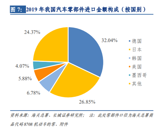 从国别看,德国、日本、韩国、美国、墨西哥是进口的主要五大国家,根据海关总署的数据来看,德国、日本、韩国、美国、墨西哥的占比分别是32.04%、26.85%、6.78%、5.88%;从进口的零部件细分产品构成来看,其中占比最高的前三项,合计占零部件进口额的71.3%。
