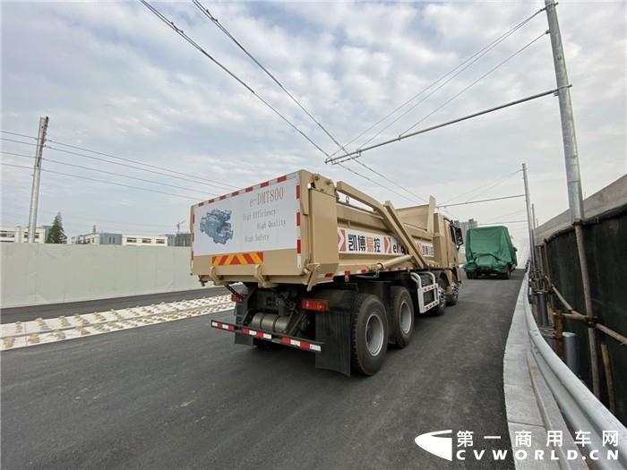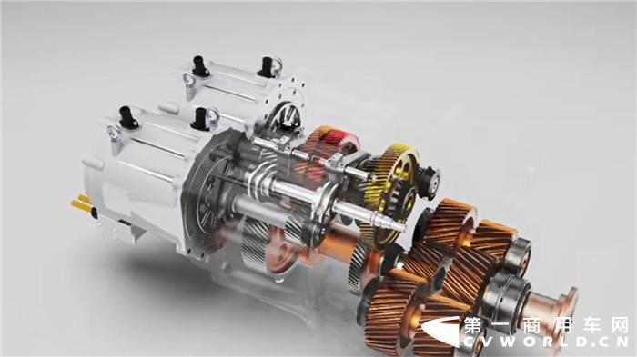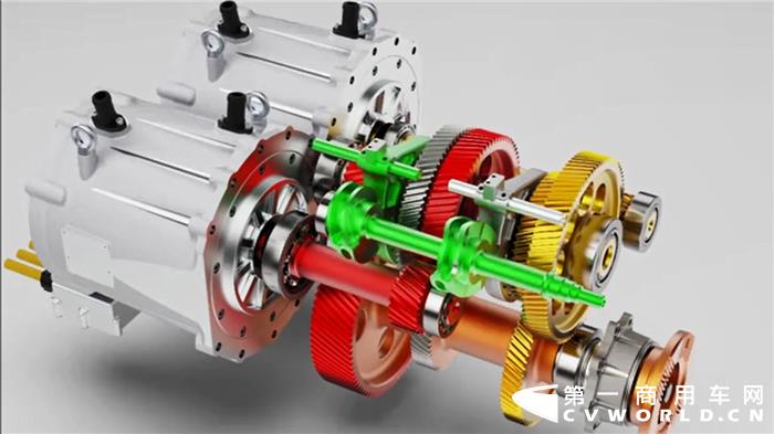 eDMT系统采用双动力源技术路线,通过两个高速、高效电机及多模变速箱的组合,确保了换挡过程无动力中断,有效解决了现有电动卡车驱动系统无法应用于复杂路况的问题。