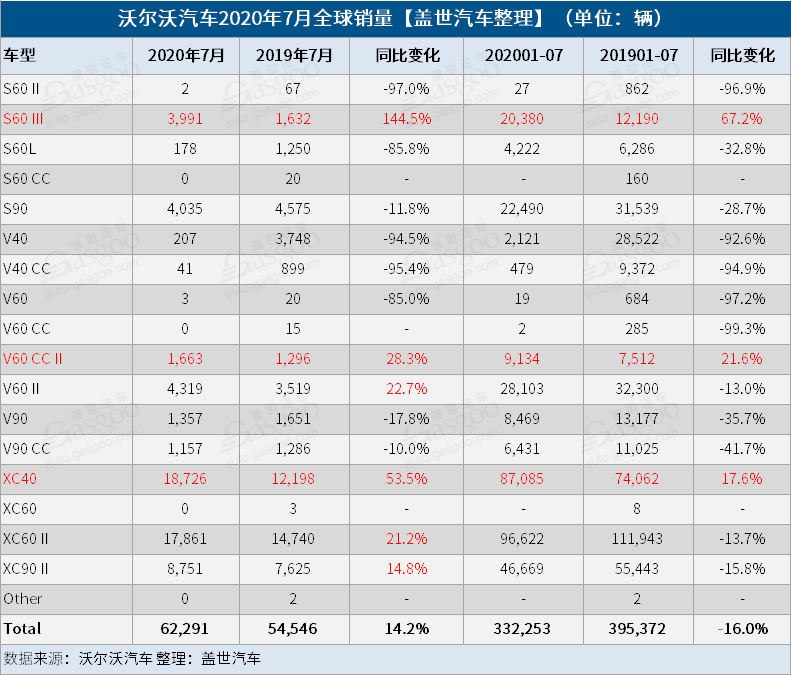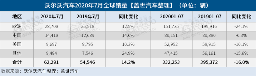 根据沃尔沃汽车官方公布的销量数据,今年7月份,沃尔沃在全球范围内共售出62,291辆新车,同比增长14.2%。其中欧洲、美国和中国这三大主要市场的销量相比去年同期均实现了两位数增长,成为拉动沃尔沃销量上涨的主要推动力。今年前七个月,沃尔沃全球共售出332,253辆汽车,与去年同期相比下降16%。