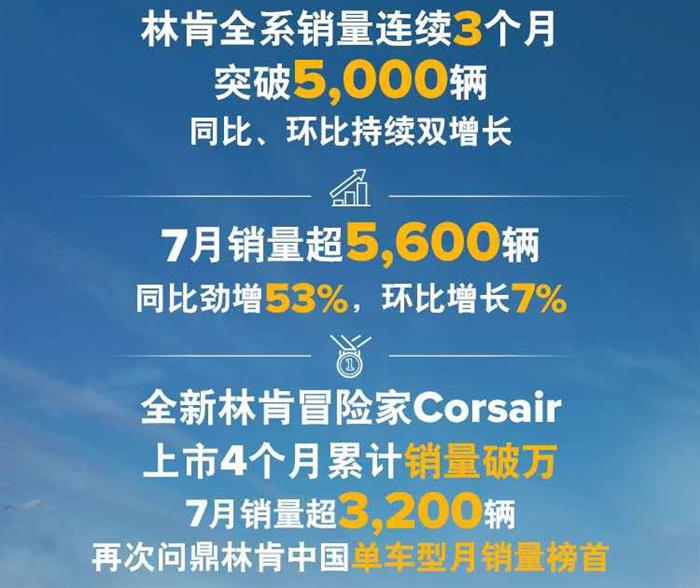 7月份,林肯品牌在华销量取得突破性增长,达到5600辆,同比增长53%,单月环比增7%。取得出色销量的背后,主要是全新林肯冒险家成功上市带来的加成。全新冒险家作为林肯首款国产车型,上市4个月累计销量破万,如今已经成为了林肯中国最畅销的车型,7月单月销量达3,200辆,占整体销量比重达57%。