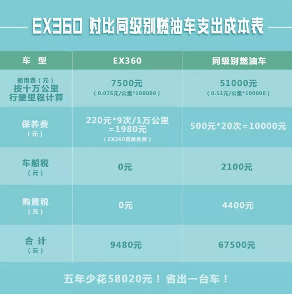 相信大家对于EX360的经济性已经有了一定的了解,无论是购车成本、用车成本、保养成本,EX360相比燃油车都表现得更加经济。假如以五年行驶10万公里计算,EX360相比于同级燃油车能够直接节省出一台EC系列的钱。这样,用户还可以再为家里添置一台卫蓝座驾,方便全家人畅享绿色出行。