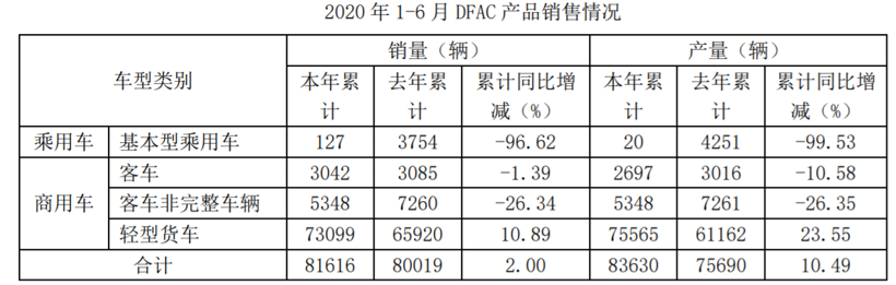 二季度商用车和整体车市的复苏为东风汽车提供了利好,东风汽车在财报中表示,今年以来,为进一步防范经营风险,抗击疫情冲击,公司主动调整了产品结构。上半年轻卡销售7.31万辆,同比增长10.89%,涨幅两倍于行业平均水平;客车整车销售0.3万辆,与行业持平;客车底盘销售0.53万辆,保持市占率第一,同时,其乘用车销量也实现了战略性调整。