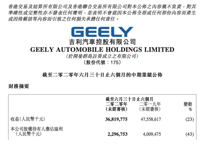 8月17日,吉利汽车控股有限公司发布2020年上半年的中期业绩,上半年,吉利汽车收益368.2亿元,同比下降23%,净利润22.97亿元,同比下降43%。