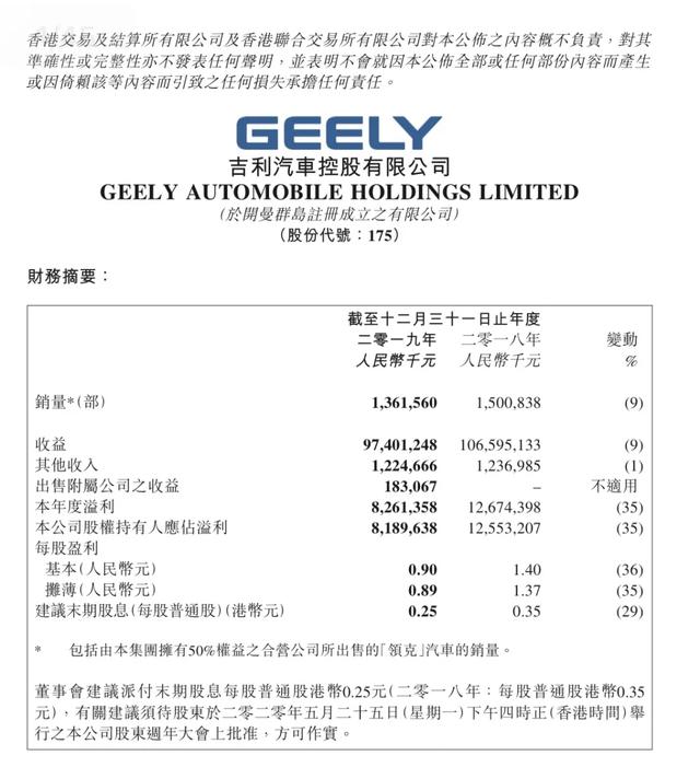 3月30日,吉利汽车控股有限公司(港股代码:0175)在线上发布了2019年的财务报告。