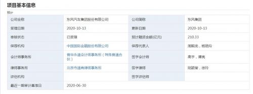 10月13日,深圳证券交易所(以下简称“深交所”)披露,已受理东风汽车集团股份有限公司(以下简称“东风汽车集团”)创业板上市申请。东风汽车集团预计融资金额为210.33亿元,其保荐机构为中国国际金融股份有限公司。