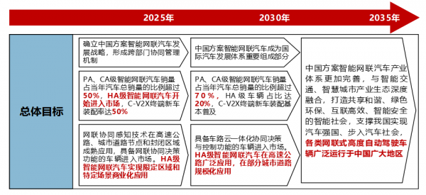 到2035年,中国方案智能网联汽车技术和产业体系全面建成、产业生态健全完善,整车智能化水平显著提升,网联式高度自动驾驶智能网联汽车大规模应用。由于采用智能化和网联化技术,驾乘安全性和舒适性显著提高,交通事故和人员伤亡数量大幅降低,交通出行和物流运输效率显著提升,道路交通能源消耗和污染排放有效降低。中国方案智能网联汽车关键核心技术处于国际领先水平,有效助推汽车产业转型升级、新兴产业经济重构和安全、高效、绿色的汽车社会文明形成,促进建设世界汽车强国的战略目标实现。