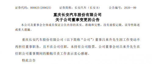 11月12日晚,长安汽车发布公告表示,公司董事吕来升因工作变动不再担任董事职务,且不在公司任职,未持有公司股票。