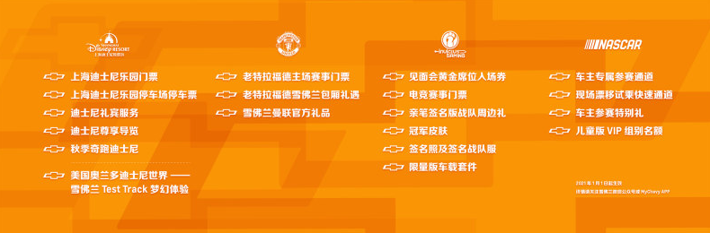基于此,雪佛兰送给车主的福利之一就是50项车主特权,据悉,特权包括4大类别7大系列,涵盖迪士尼、曼联、iG战队等多个品牌知名合作伙伴的平台资源以及U·CLUB会员特权和各类官方活动体验权益。雪佛兰车主可以兑换上海迪士尼门票,尊享迪士尼贵宾服务,还能收获独家放送的秋季奇跑迪士尼名额;此外,2020-2021赛季曼联英超主场比赛的门票、iG战队电竞赛事门票等都在福利清单中。而由雪佛兰官方主办的陆上飞行秀、直通NASCAR挑战赛等系列活动也为车主量身定制了亲临现场的席位。