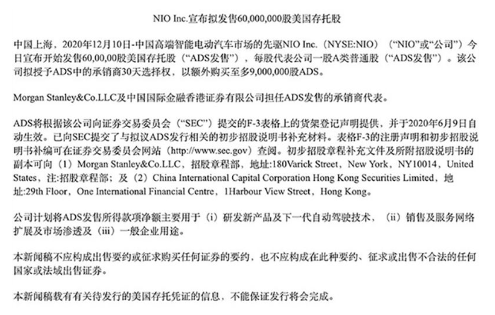 除此之外,蔚来汽车还将增发6000万股美国存托股份(ADS),增发价定在每股ADS39美元。同时,承销商根据“绿鞋期权”,可以拥有30天的选择权购买额外900万股美国存托股份,蔚来汽车本轮增发最大募资为26.91亿美元。